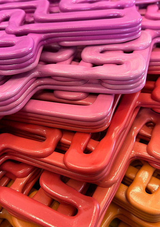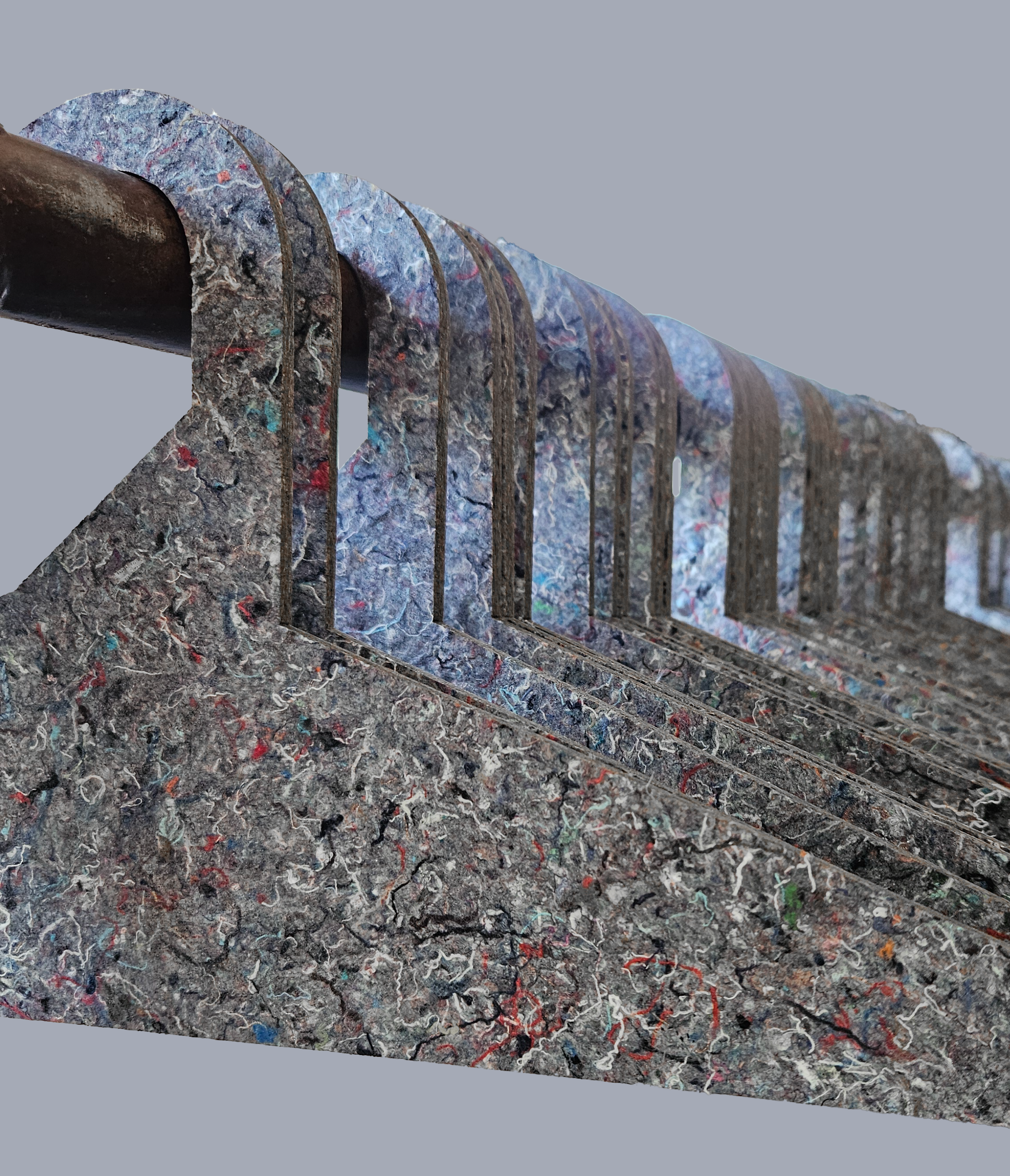 This hanger is a true result of chain collaboration. We've partnered up with Circlefied to introduce a clothing hanger crafted entirely from a bio binder and discarded textiles - former garments made from mixed fabrics that are typically difficult to recycle. As a result, such materials are often burned or buried at the end of their life. We’ve developed an innovative method to repurpose these textiles, giving them new life in a context where their story and impact are truly valued.